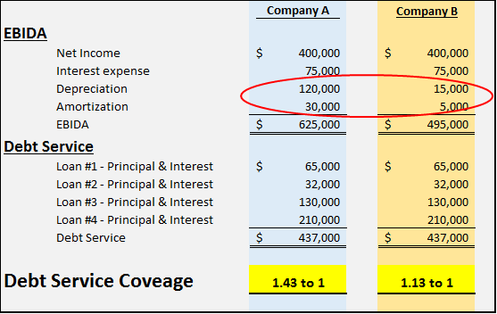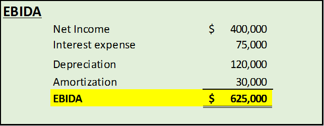 Let’s now look at a sample computation of EBIDA.  In this example, we start with net income of $400,000, add back interest expense because this is a component of debt service.     Add back depreciation and amortization because these are non-cash expense items, and we arrive at our EBIDA or cash flow of $625,000.  Be aware that these computations can vary and are dictated by your loan documents.  Some variations to this computation included subtracting distributions and subtracting unfunded capital expenditures.